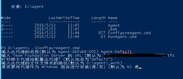 C:\agent\ConfigureAgent.cmd按照提示输入相关参数,注意:如何是默认有值的就不用再输了,如果是空的,就要填写好。
